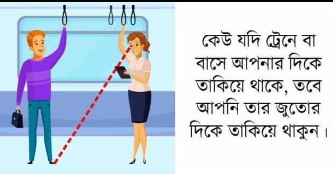 ৯. কেউ যদি ট্রেনে বা বাসে আপনার দিকে তাকিয়ে থাকে, তবে আপনি তার জুতোর দিকে তাকিয়ে দেখুন। হাল ছেড়ে দিবেন না। বিশ্বাস করুন, এটা তার মাথা খারাপ করে দিবে।