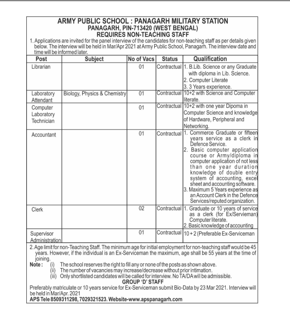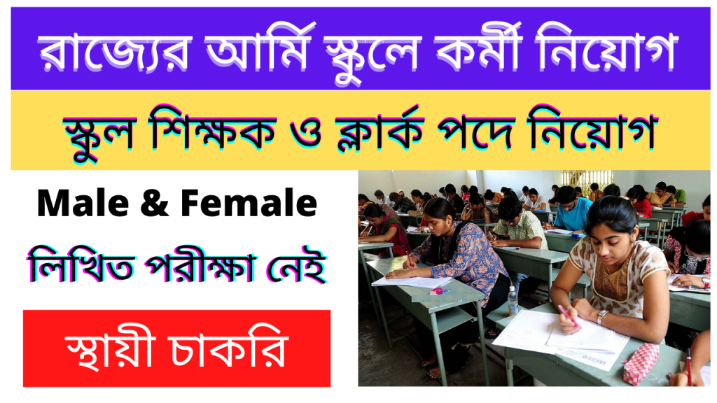 পশ্চিমবঙ্গের একটি সরকারি আর্মি পাবলিক স্কুলে ক্লার্ক গ্রুপ ডি ও শিক্ষক পদে নিয়োগ করছে, এখানে পশ্চিমবঙ্গের ২৩ টি জেলা থেকে যেকোনো চাকরি প্রাথী আবেদন করতে পারবে, সরাসরি ইন্টারভিউ এর মাধ্যমে নিয়োগ করা হবে, কিভাবে আবেদন করবেন, কতগুলি শূন্যপদ রয়েছে তা এখানে নিচে বিস্তারিত ভাবে জানিয়ে দেওয়া হোলো —