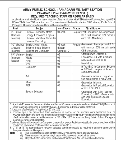 এই নিয়োগ টি করা হচ্ছে Army Public School এ এবং এটি রয়েছে বর্ধমান জেলার পানাগড়ে এবং পশ্চিমবঙ্গের যেকোনো জেলার চাকুরিপ্রাথী রা আবেদন করতে পারবে, এই অফিসিয়াল ওয়েবসাইট লিংক আপনারা নিচে পেয়ে যাবেন।