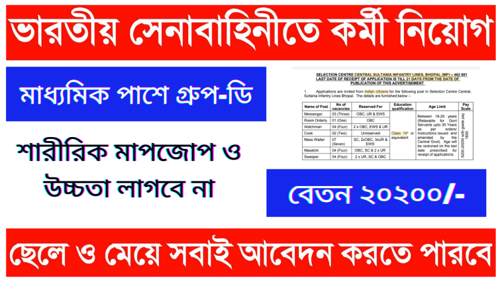 Indian Army থেকে আজ একটি নতুন চাকরির বিজ্ঞপ্তি প্রকাশিত হয়েছে, যেখানে Indian Army সম্পূর্ণ স্থায়ী পদে Group D কর্মী নিয়োগ করছে, এখানে পশ্চিমবঙ্গের যেকোনো জেলার চাকরী প্রাথী আবেদন করতে পারবে, এবং আবেন্দ করতে এখানে কোনো প্রকার শারীরিক মাপ জোপের প্রয়োজন নেই। এছাড়াও এখানে কোনো ফিজিকাল টেস্টও হবে না অর্থাৎ দৌড়, জাম্প এসব হবে না শুধুমাত্র ইন্টারভিউএর মাধ্যমে নিয়োগ করা হবে,