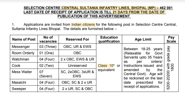 এখানে নিচে আবেদন করার ফর্ম ও সম্পূর্ণ নোটিশ টি দেওয়া হোলো যদি কেউ আবেদন করতে চাও তাহলে ডাউনলোড করে সম্পূর্ণ ফর্ম টি ফিলাপ করে ডাকযোগে পাঠাতে হবে এই ঠিকানায় – CENTRAL SULTANIA INFANTRY LINES, BHOPAL (MP) – 462 001